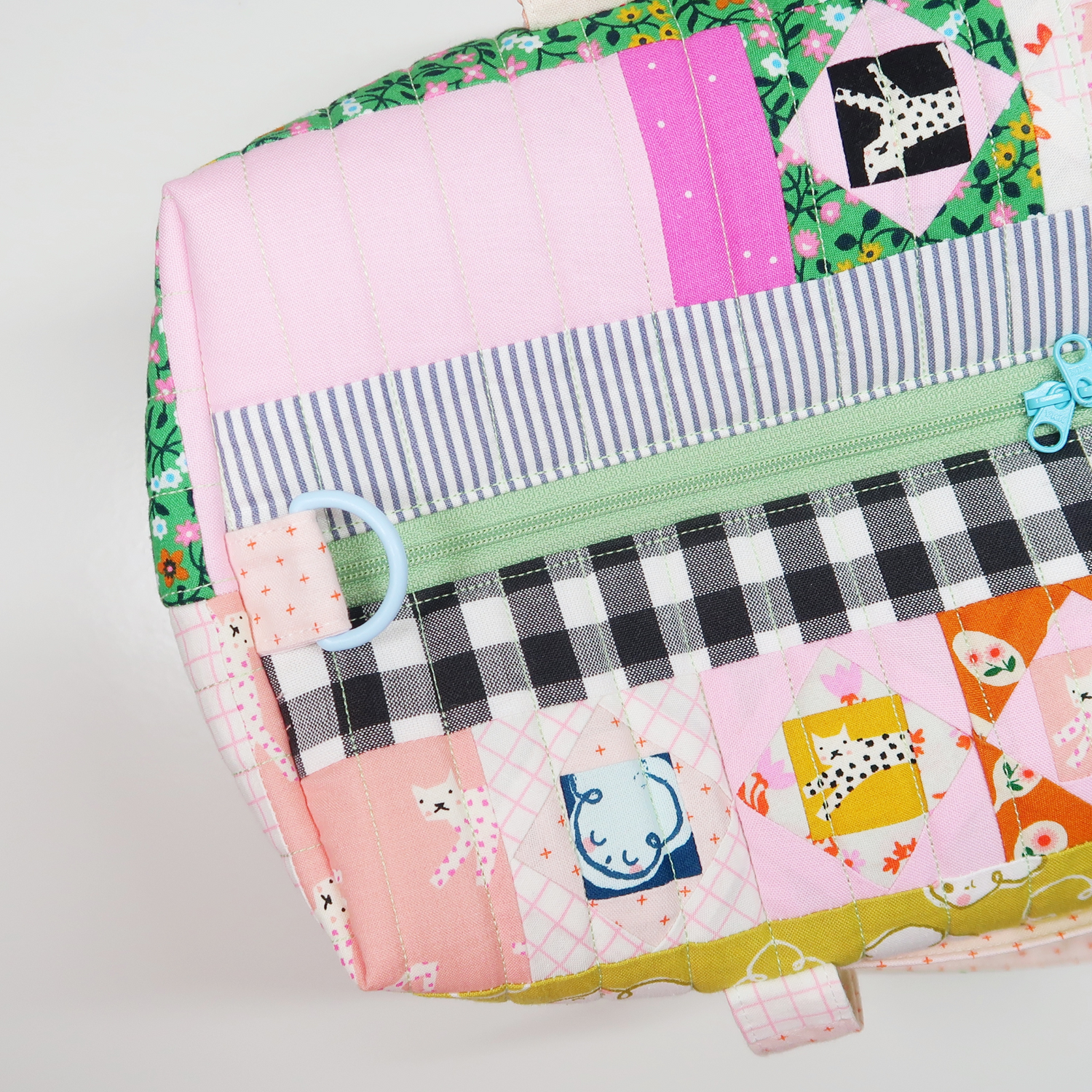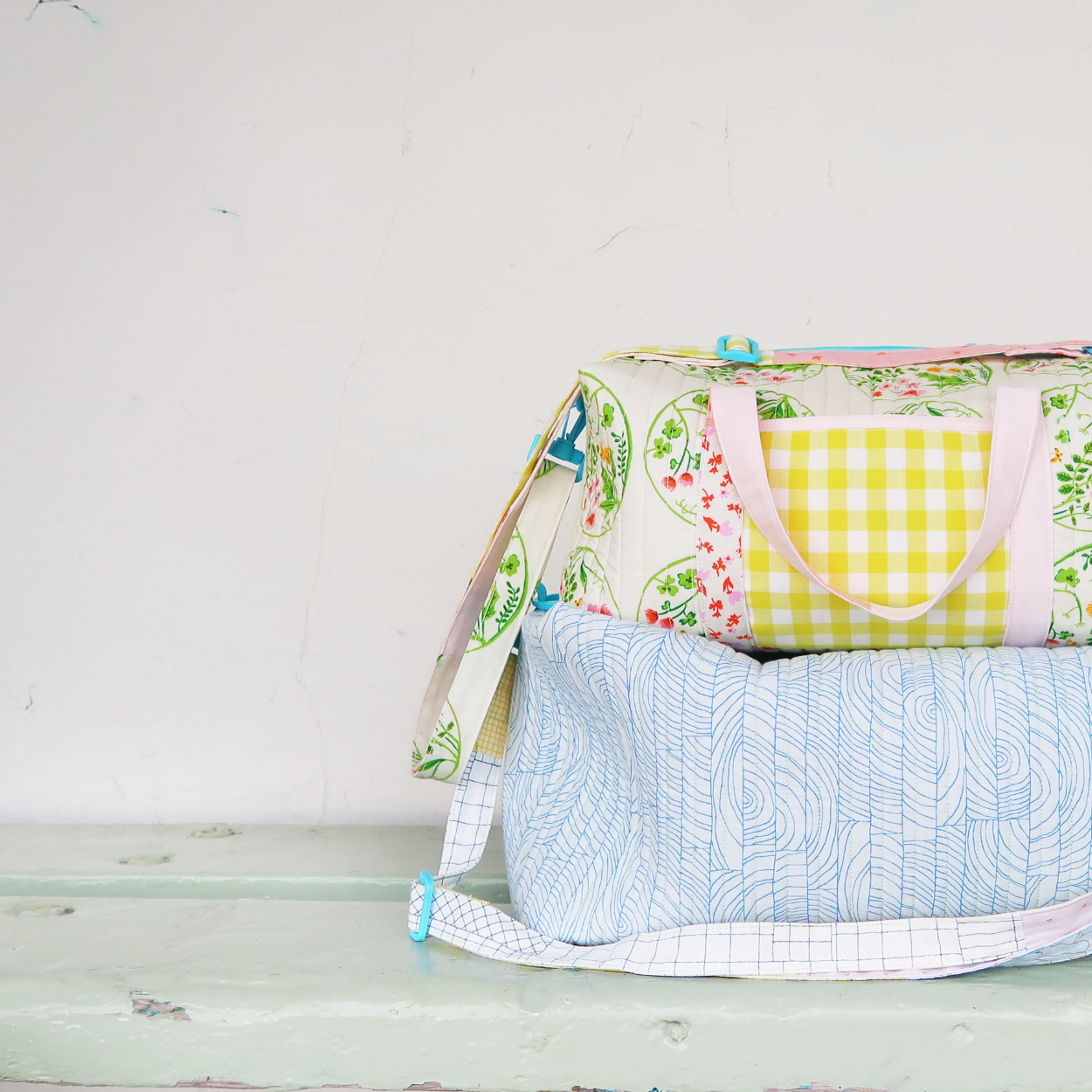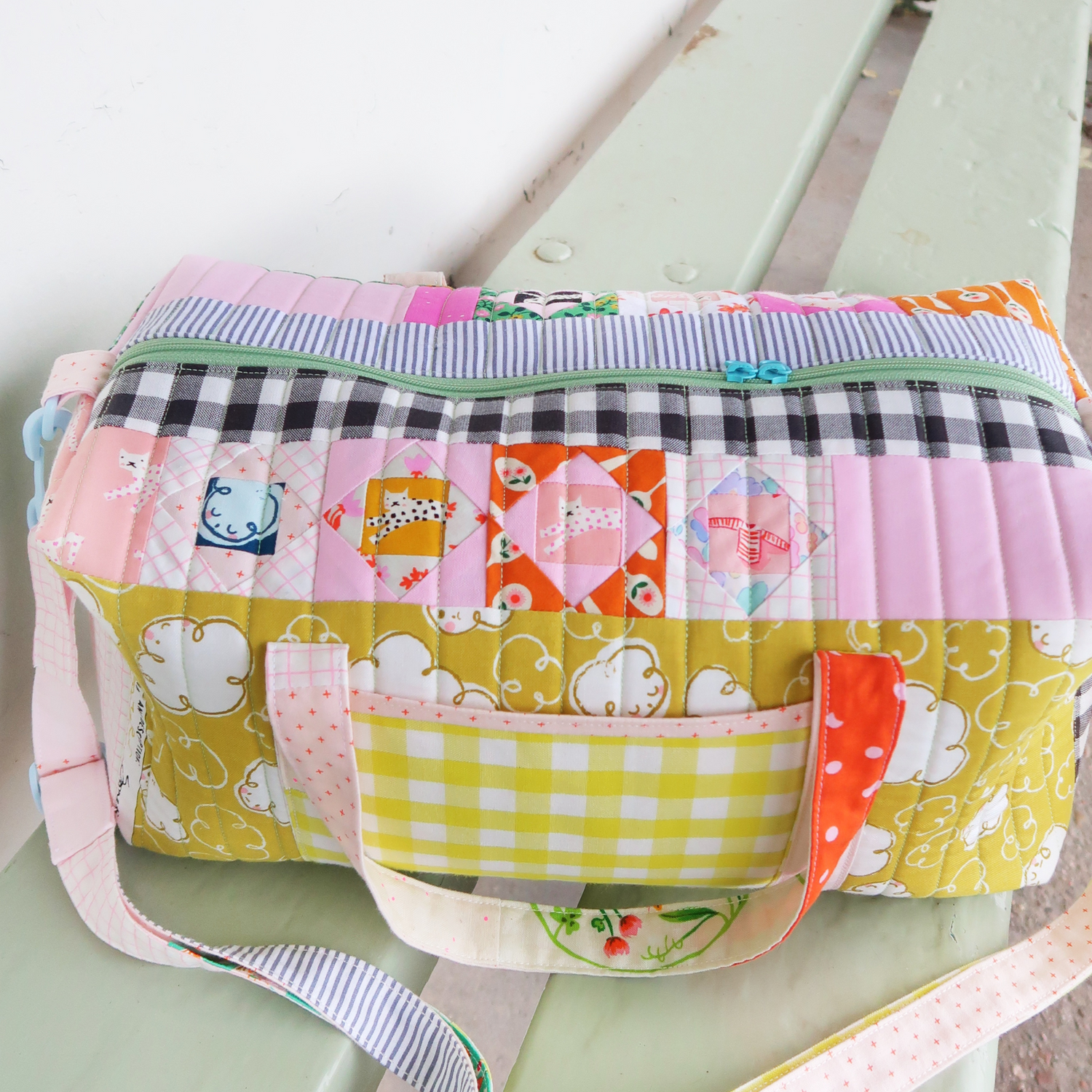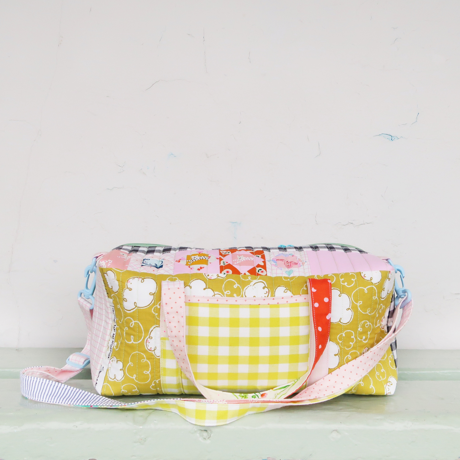 - Materials used: quilting cotton, soft and stable (or quilt batting/ fusible fleece as an alternative for a much softer version), zipper (15" or longer for the Mini and 18" or longer for the Large Duffle), hardware for the strap (two D-rings, two swivel hooks and a slider) and thread