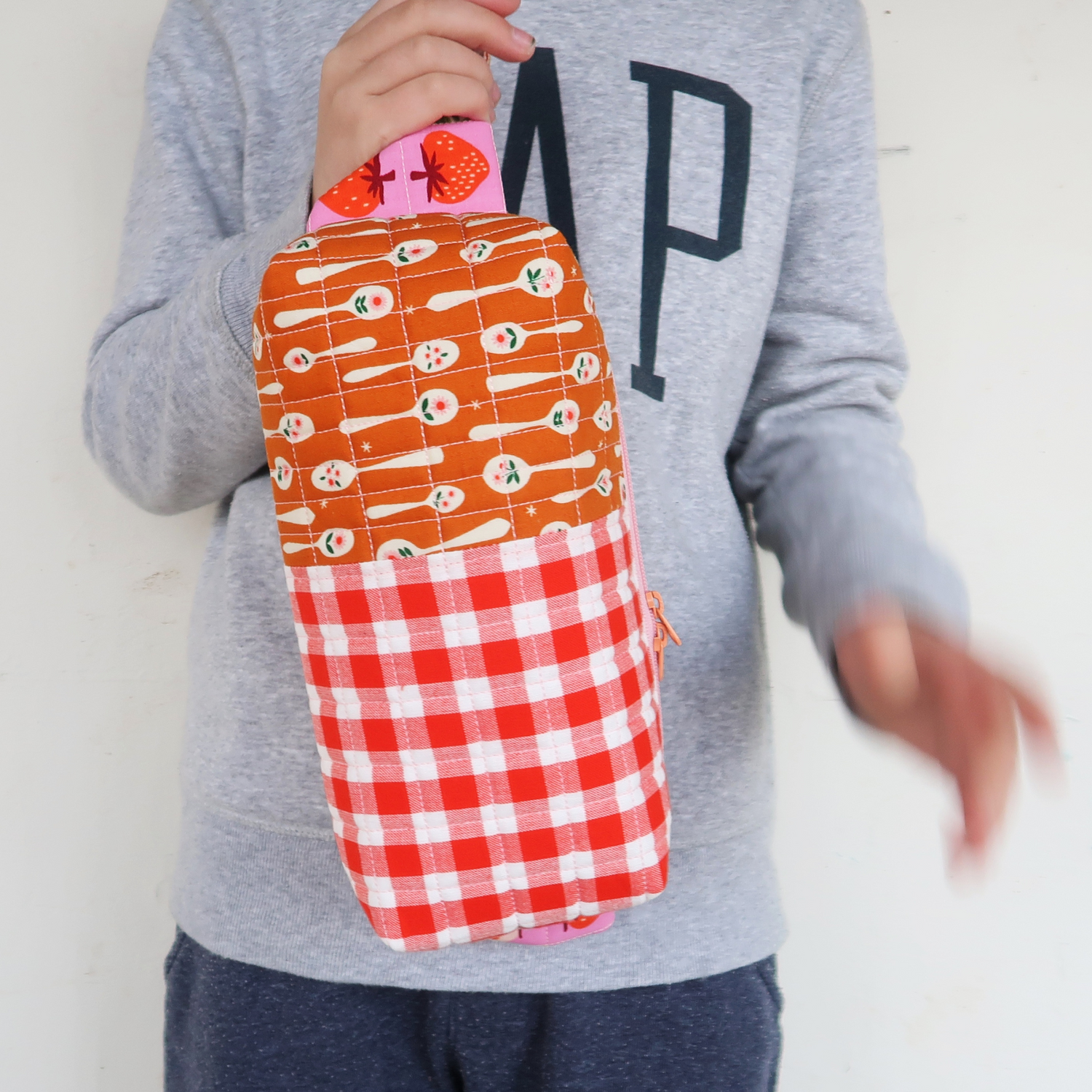 - Materials used: quilting cotton, soft + stable (or use fusible fleece, left over quilt batting for a softer bag), plastic zipper (10" or longer), a slider and buckle