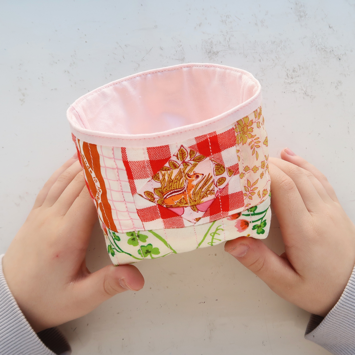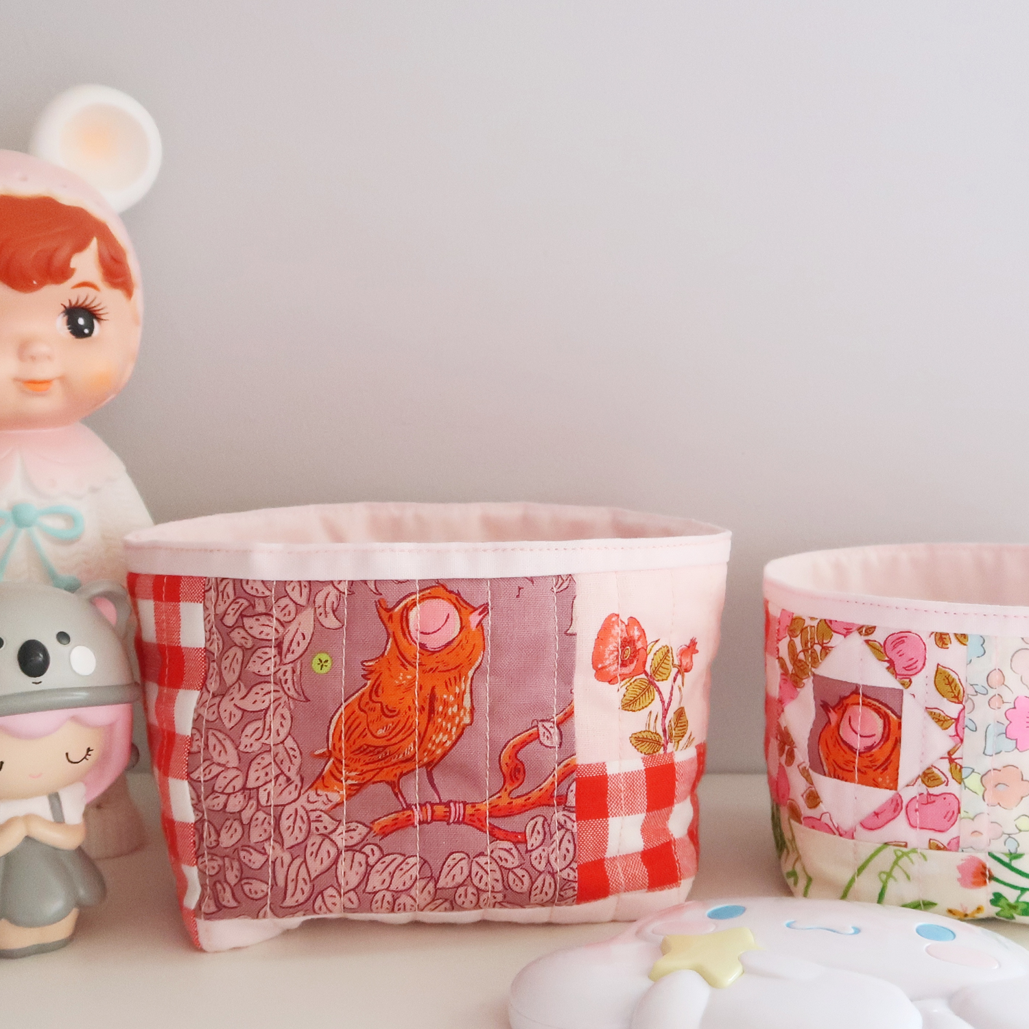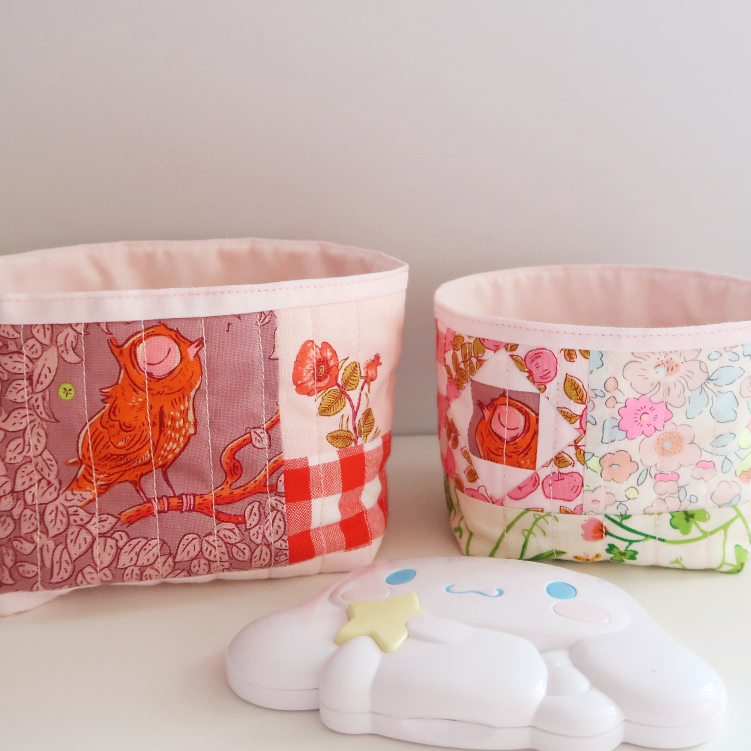 - Materials used: quilting cotton, thread and a piece of scrap batting (if you're choosing to quilt your basket)